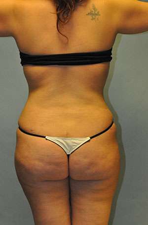 42 year-old woman, 5’4”, 140 lbs., 4 children, 3 months after power-assisted SAFE lipo of abdomen, waist, flanks and bra rolls, and fat transfer 275 cc to buttocks, each side, and drainless tummy tuck.